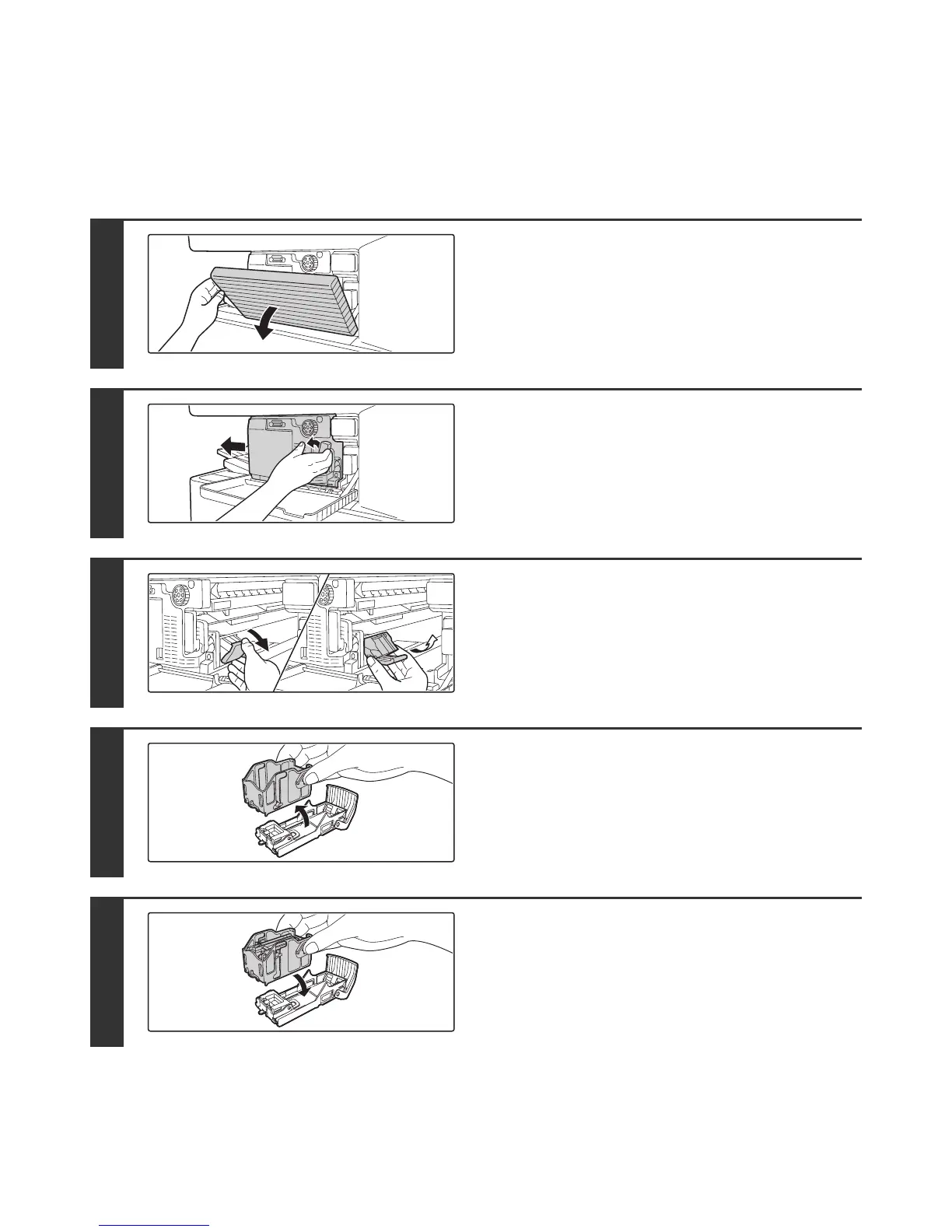 When the staple cartridge runs out of staples, a message will appear in the operation panel. Follow the procedure below