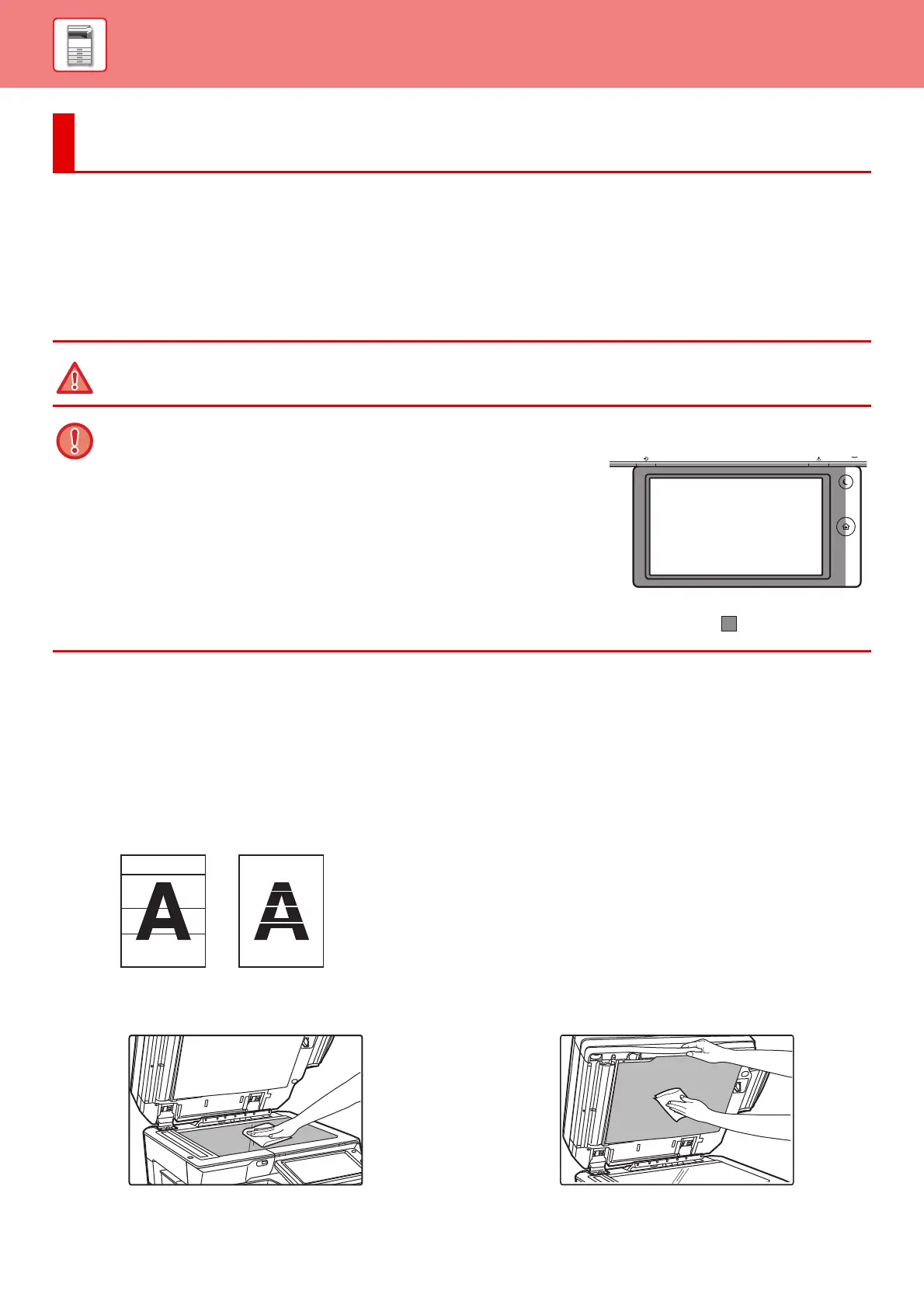 If the document glass or document backplate sheet becomes dirty, the dirt will appear as dirty spots, coloured lines, or
