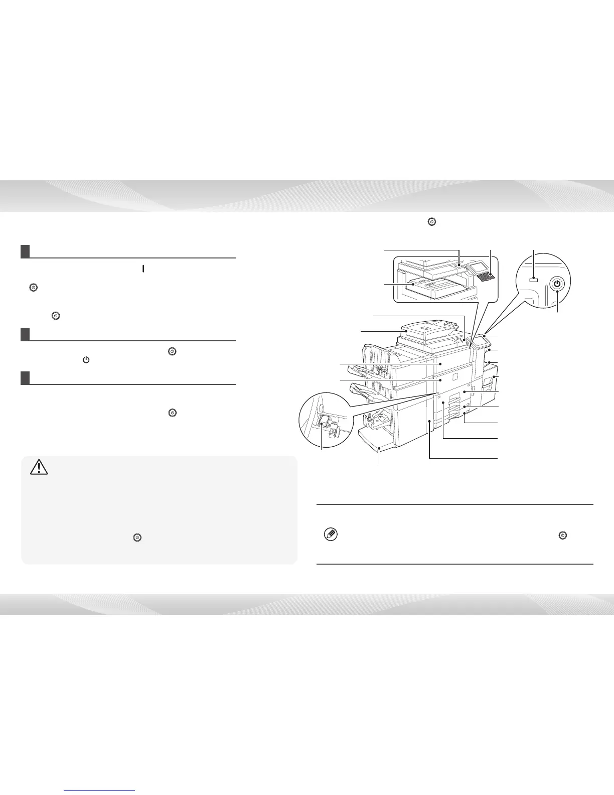 The machine has two power switches: The main power switch inside the front cover located in the lower left corner, and the [Power] button ( ) on the operation panel.