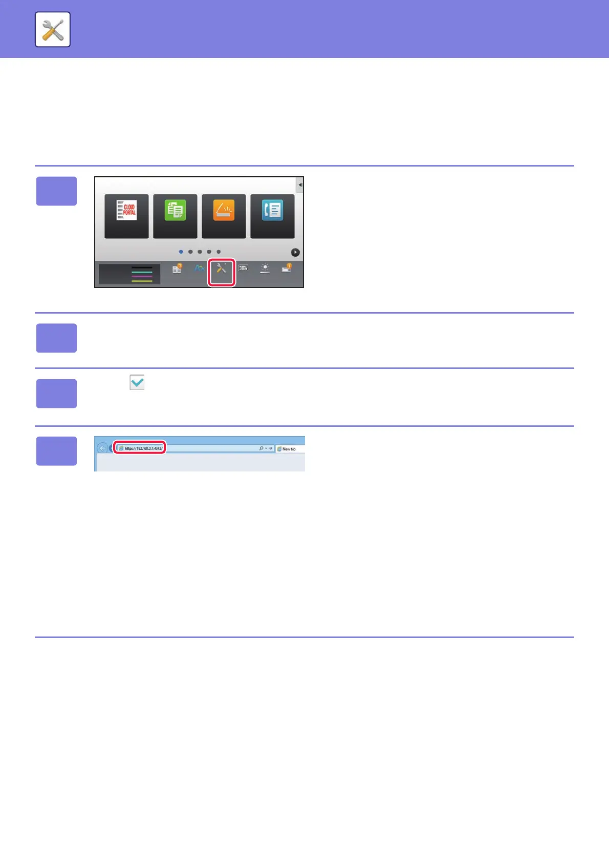 From the setting mode of the machine, print the IP address of the machine and enter the address on the PC’s Web