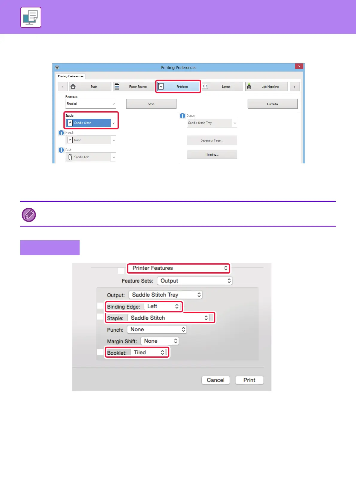 When a saddle stitch finisher (large capacity) is installed and the job is not output correctly with [Saddle Stitch], select