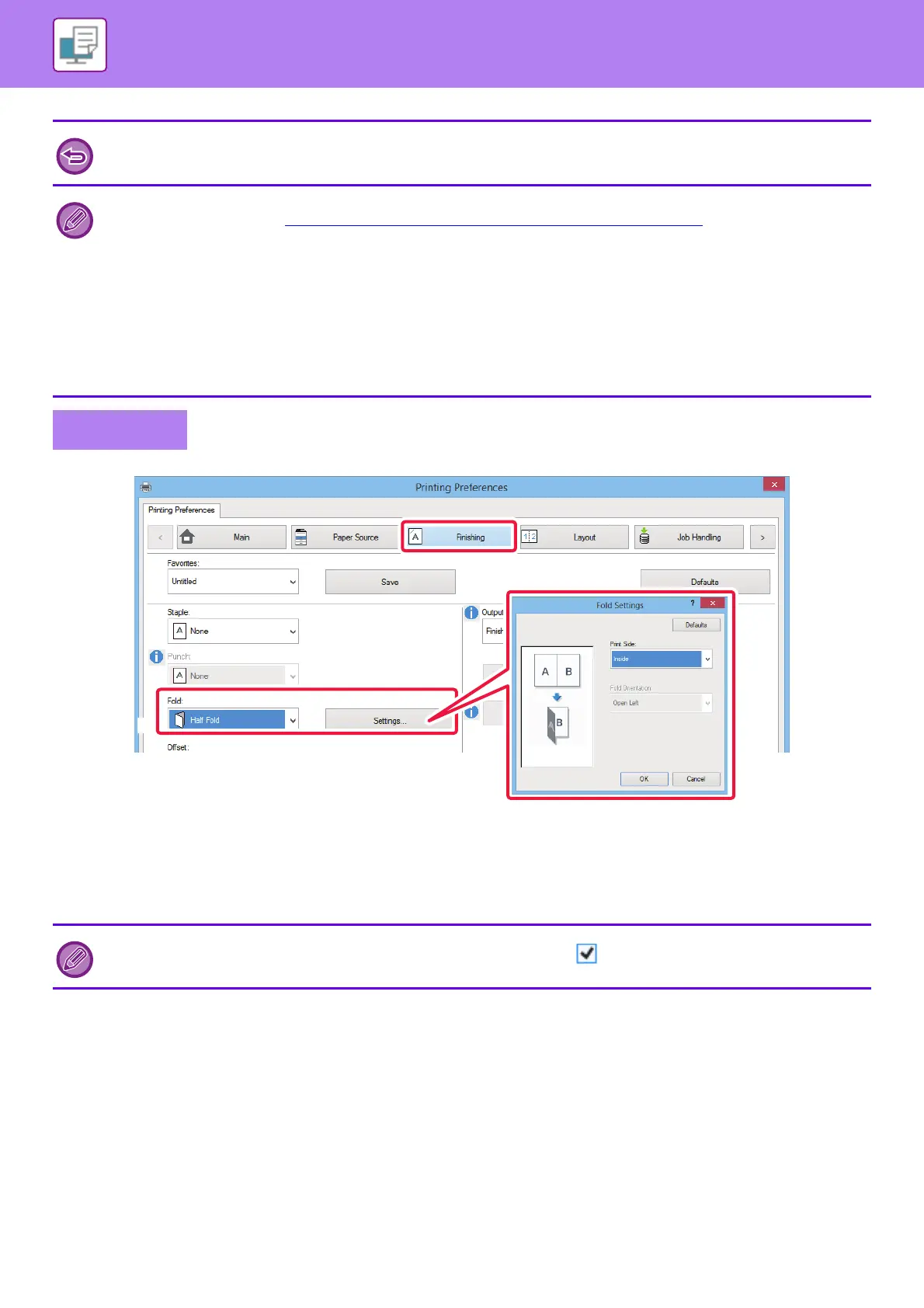 • When printing data in a pamphlet layout, the "Booklet" function can be used to conveniently fold and staple printed output