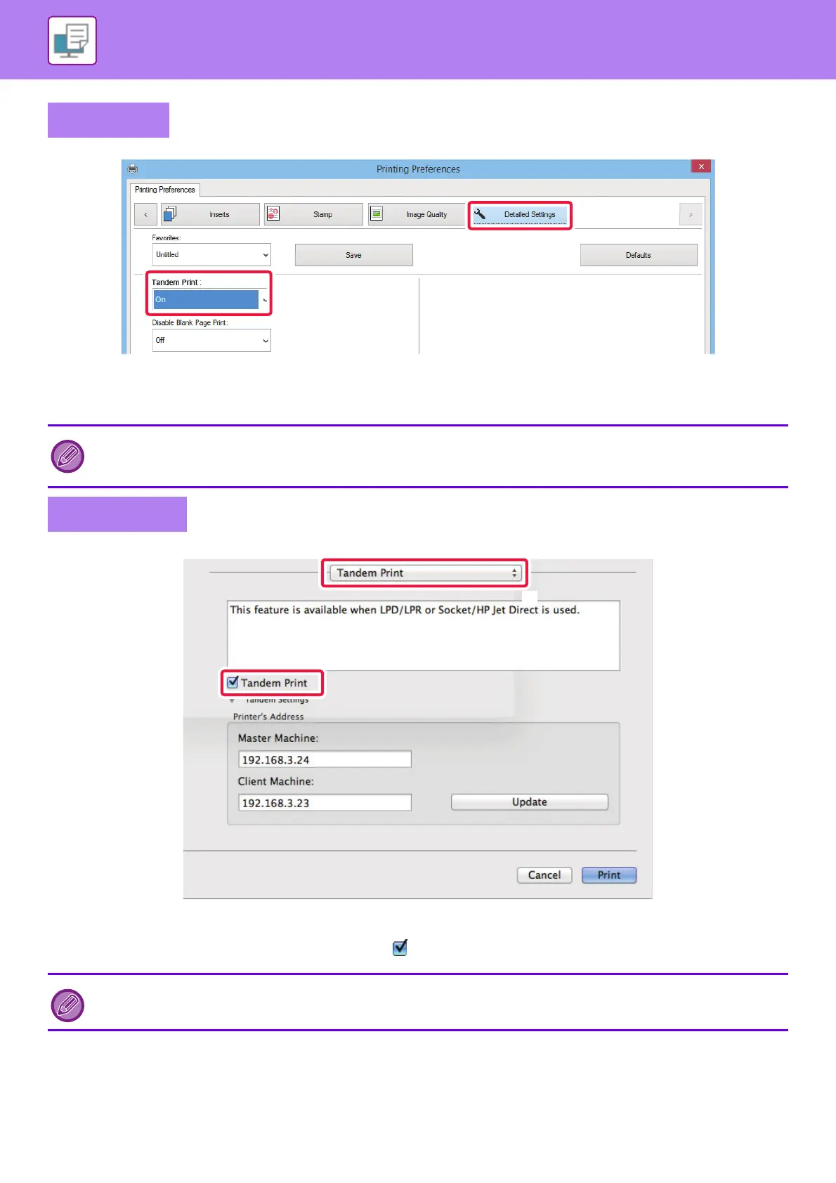The tandem print function can be used only when the printer driver has been installed using "Custom Installation" with [LPR