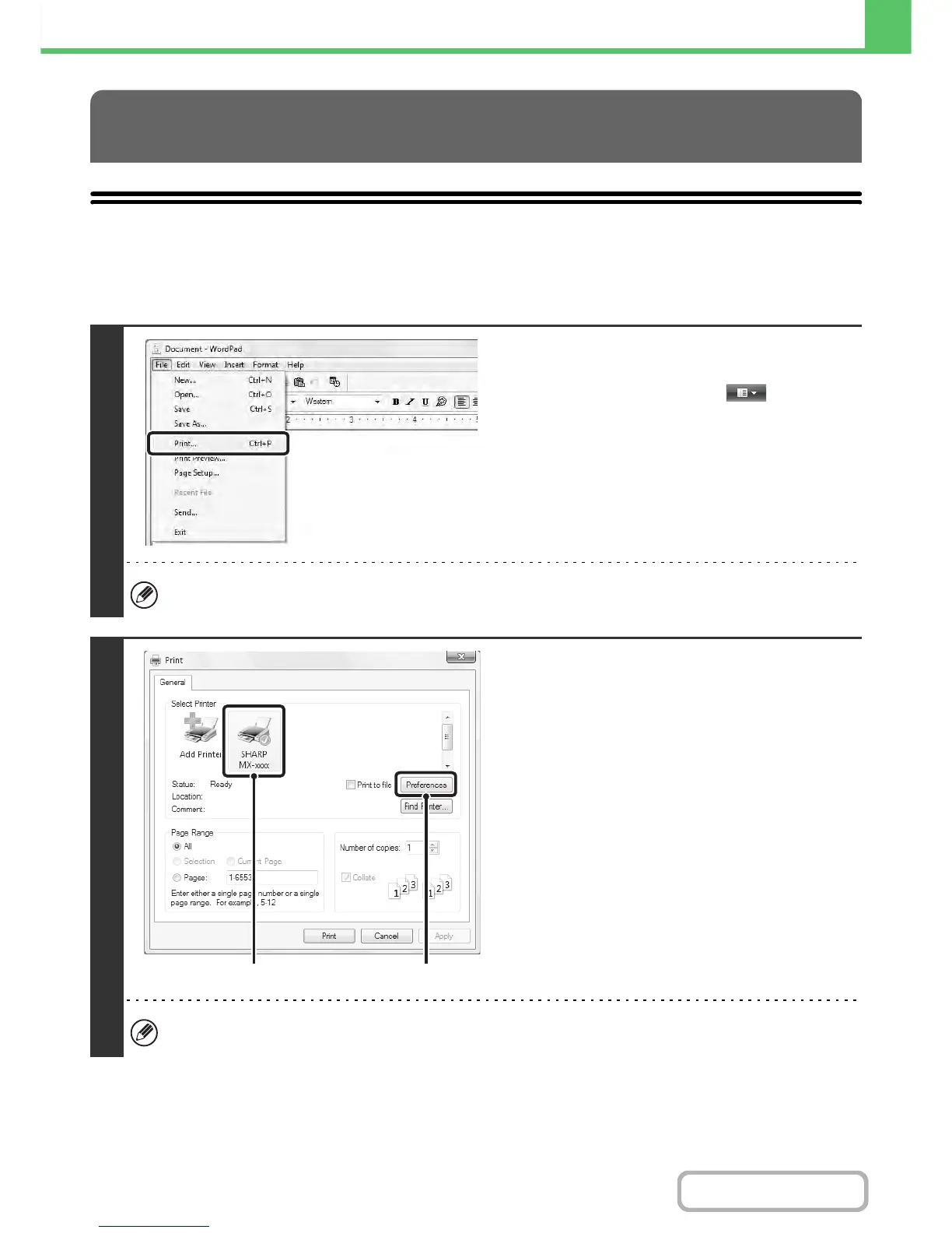 The following example explains how to print a document from "WordPad", which is a standard accessory program in