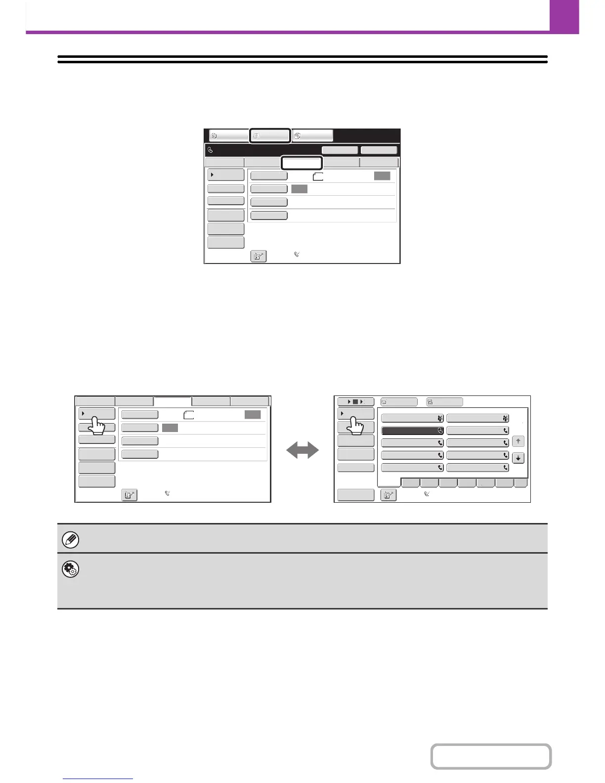 Transmission destinations can be stored in one-touch keys in the address book and retrieved from the address book