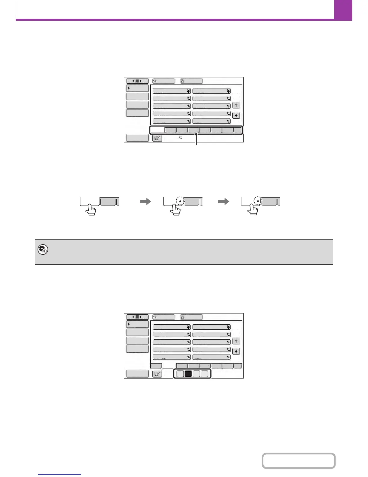 the [ABCD] tab is touched, keys from "A" to "D" appear. If the [B] key is touched, only destinations starting with the letter