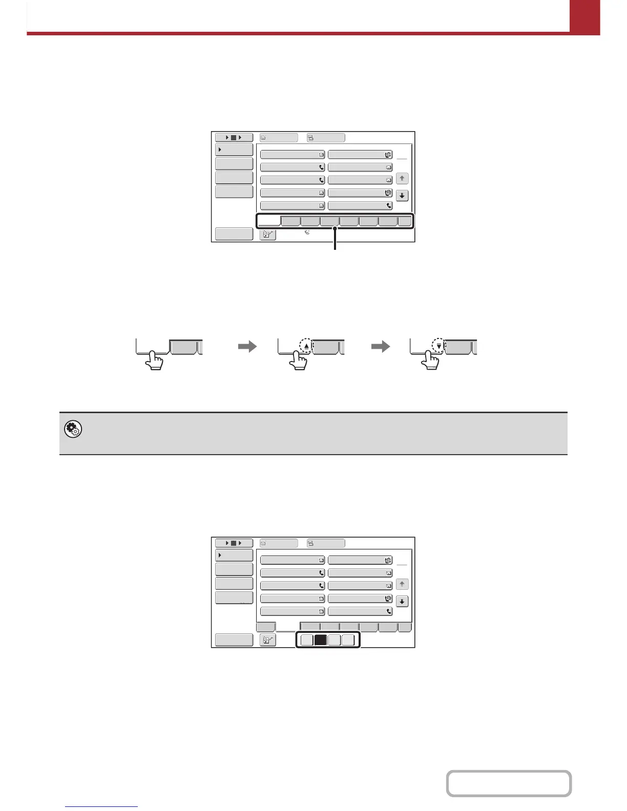 the [ABCD] tab is touched, keys from "A" to "D" appear. If the [B] key is touched, only destinations starting with the letter