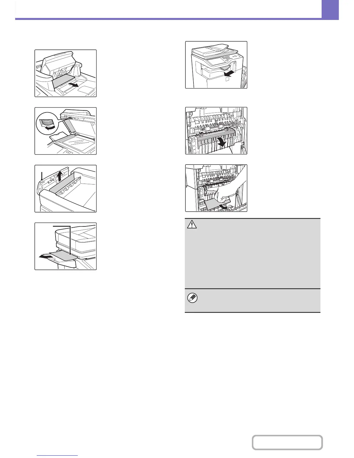 • The fusing unit area is hot. Take care not to