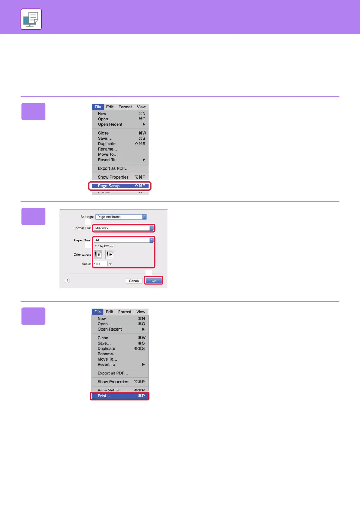 The following example explains how to print an A4 size document from "TextEdit", which is a standard accessory