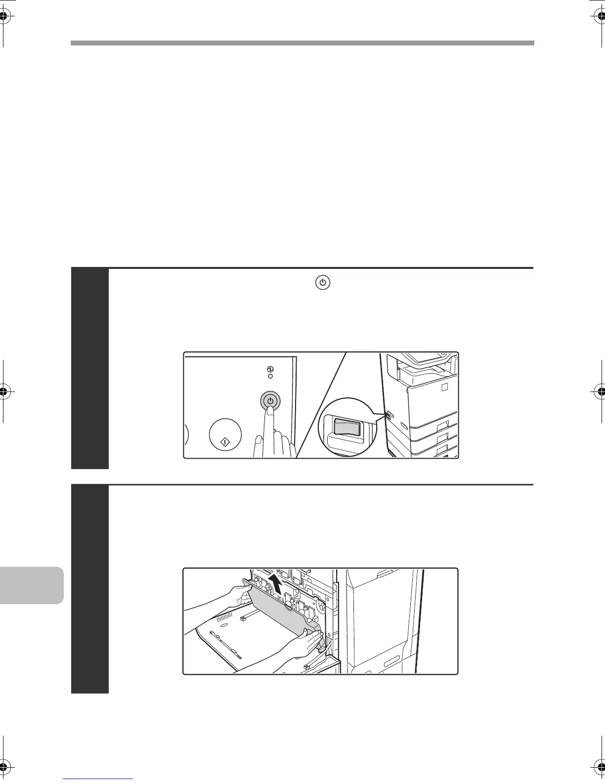 Before replacing the developer cartridge or drum cartridge, turn off the main