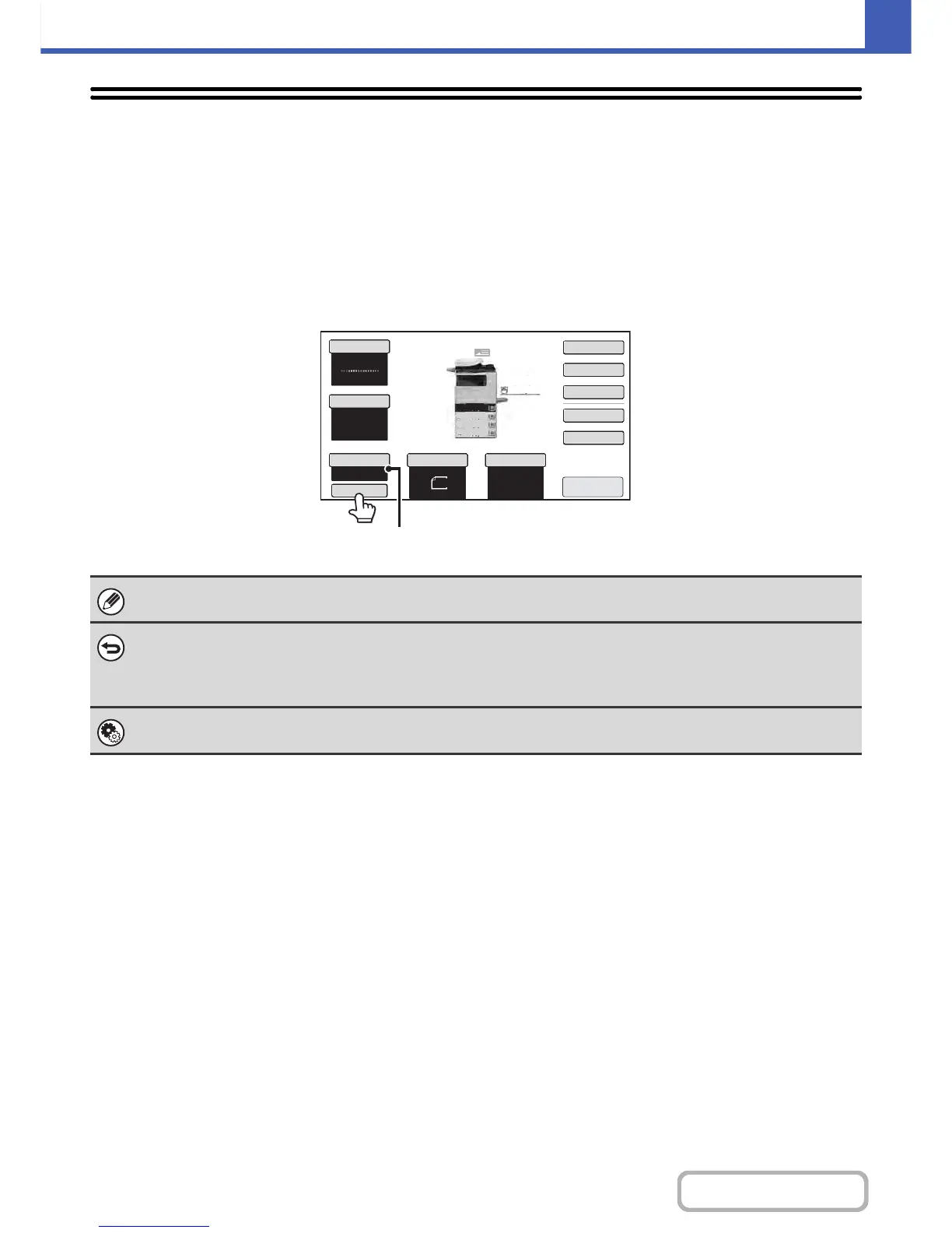 To return the ratio setting to 100%, touch the [Copy Ratio] key to display the ratio menu and then touch the [100%] key.