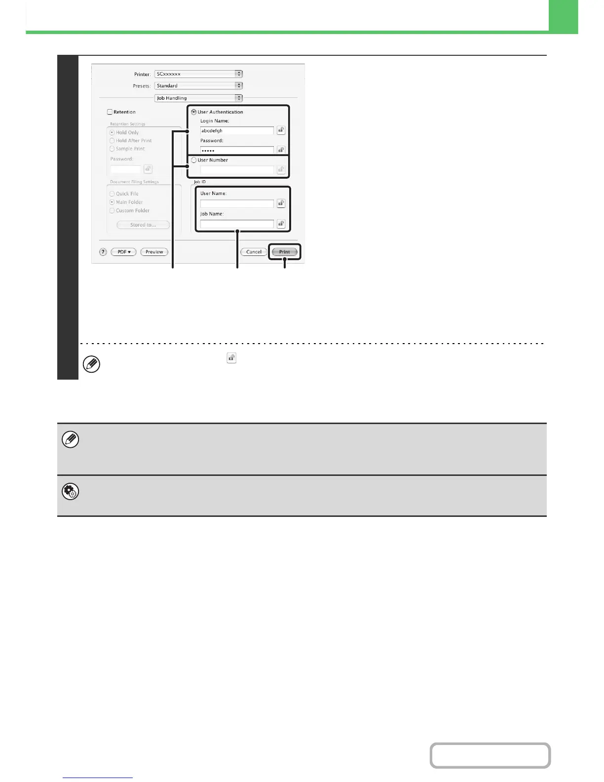 When user authentication is enabled in the system settings (administrator), printing is possible without entering user