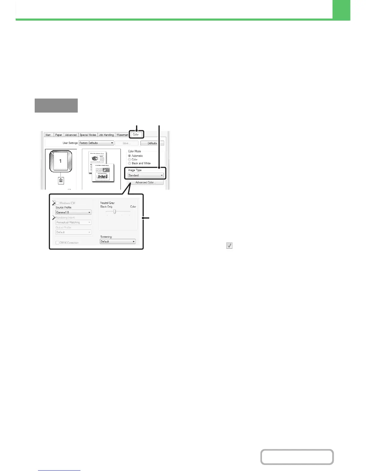 Advanced color settings can also be configured to match the objective of the color image, such as color management