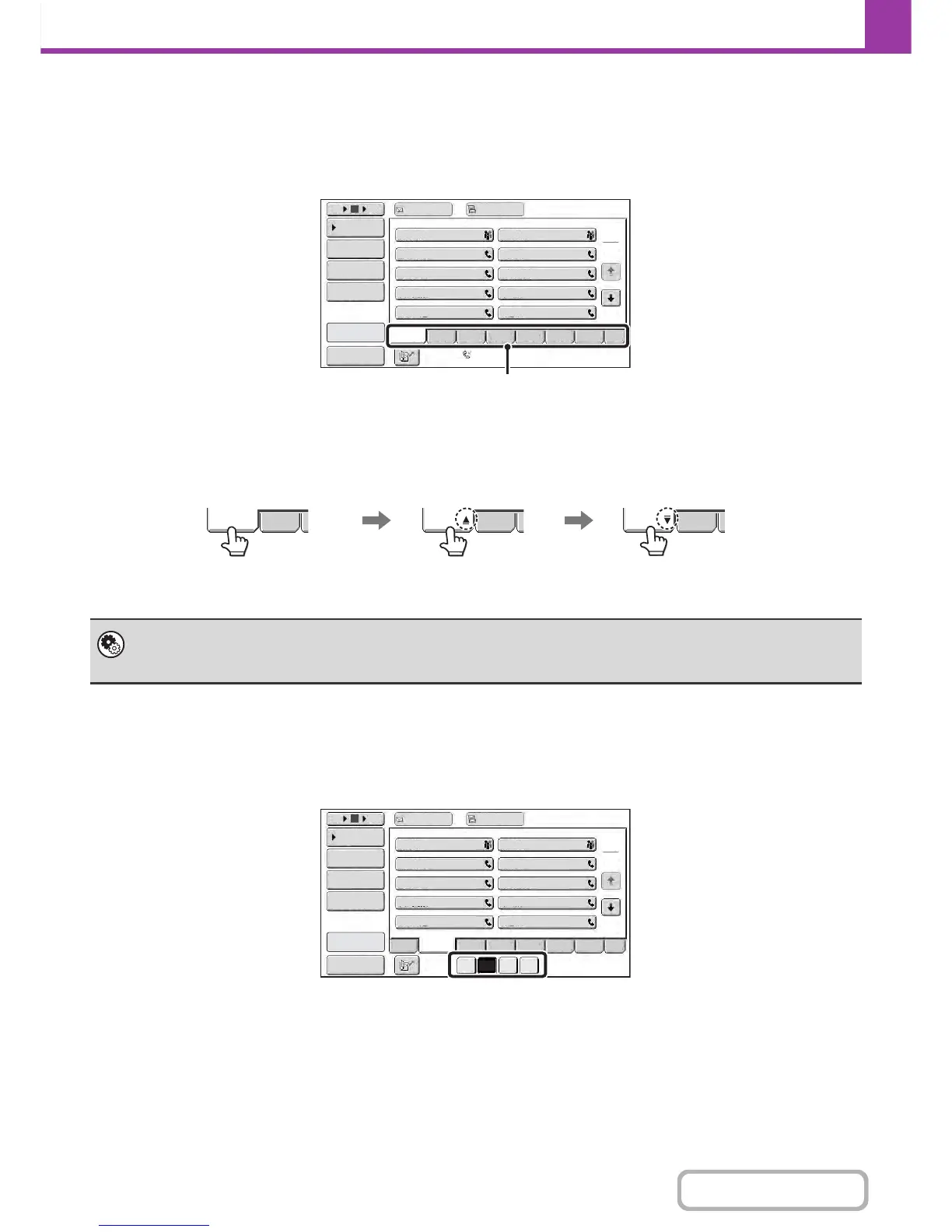 the [ABCD] tab is touched, keys from "A" to "D" appear. If the [B] key is touched, only destinations starting with the letter