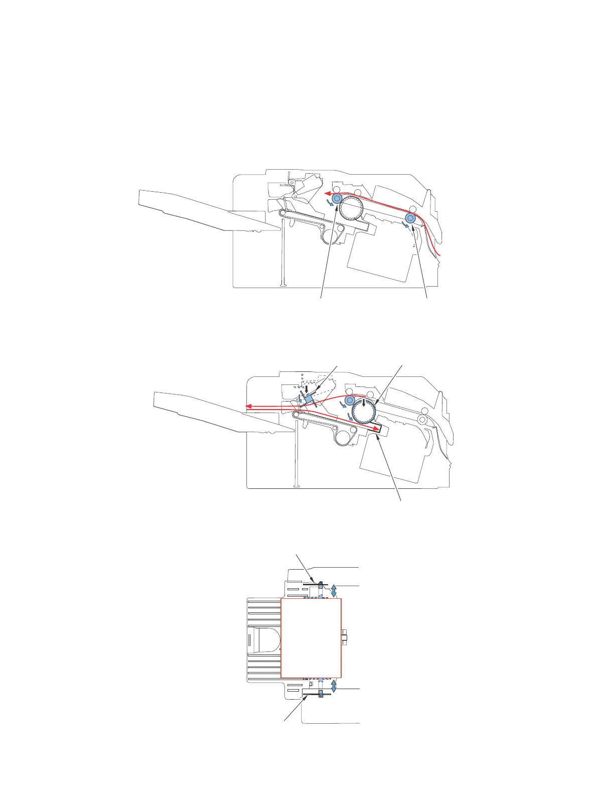 2) The paper delivered by the delivery roller is fed toward the processing tray by the paddle. The return belt feeds the paper to the processing tray's