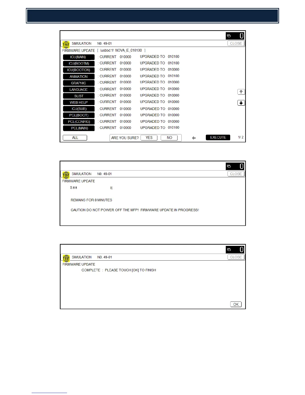 7. Once the firmware update has completed successfully, select OK (MFP should reboot).