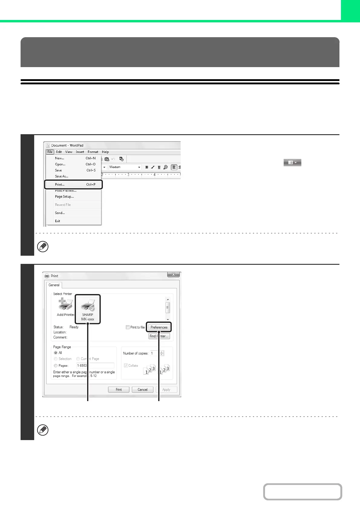 The following example explains how to print a document from "WordPad", which is a standard accessory program in