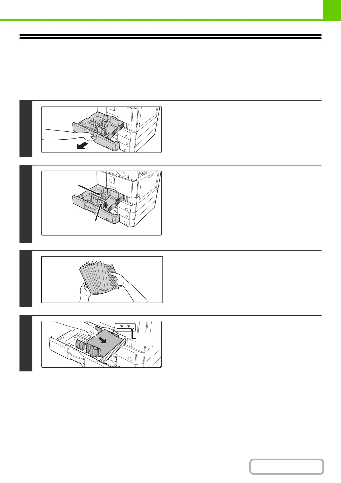 A maximum of 500 sheets of paper from size 8-1/2" x 11"R to 11" x 17" (B5R to A3) can be loaded in trays 1 to 4.