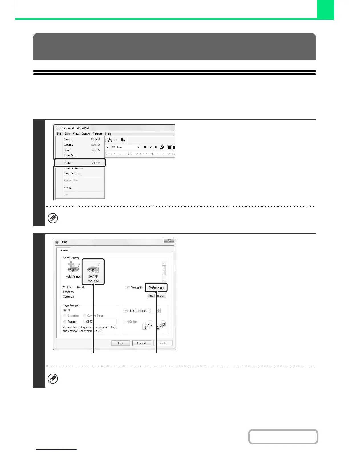 The following example explains how to print a document from "WordPad", which is a standard accessory program in