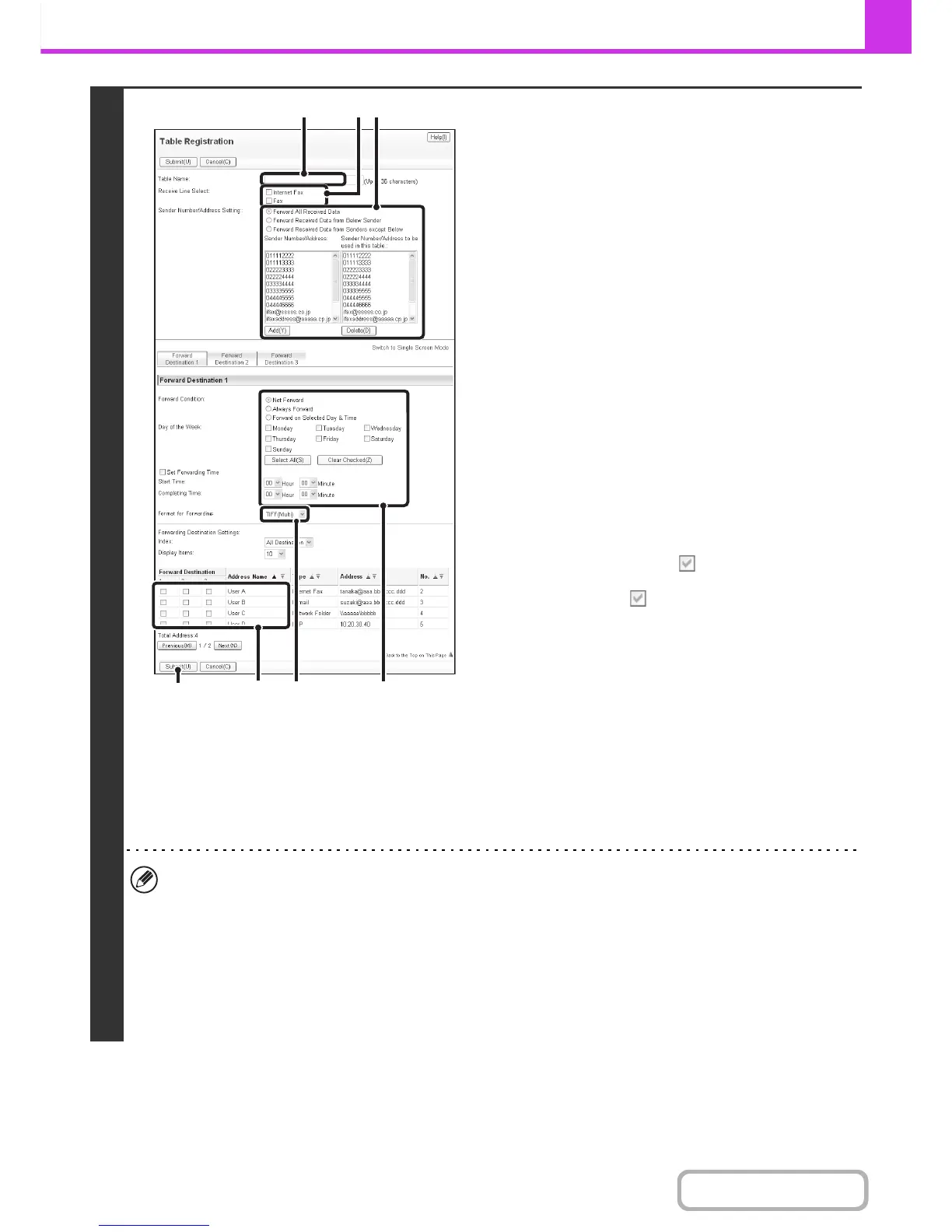 • Up to three forwarding day and time settings can be set for one forwarding table, and a forwarding destination can