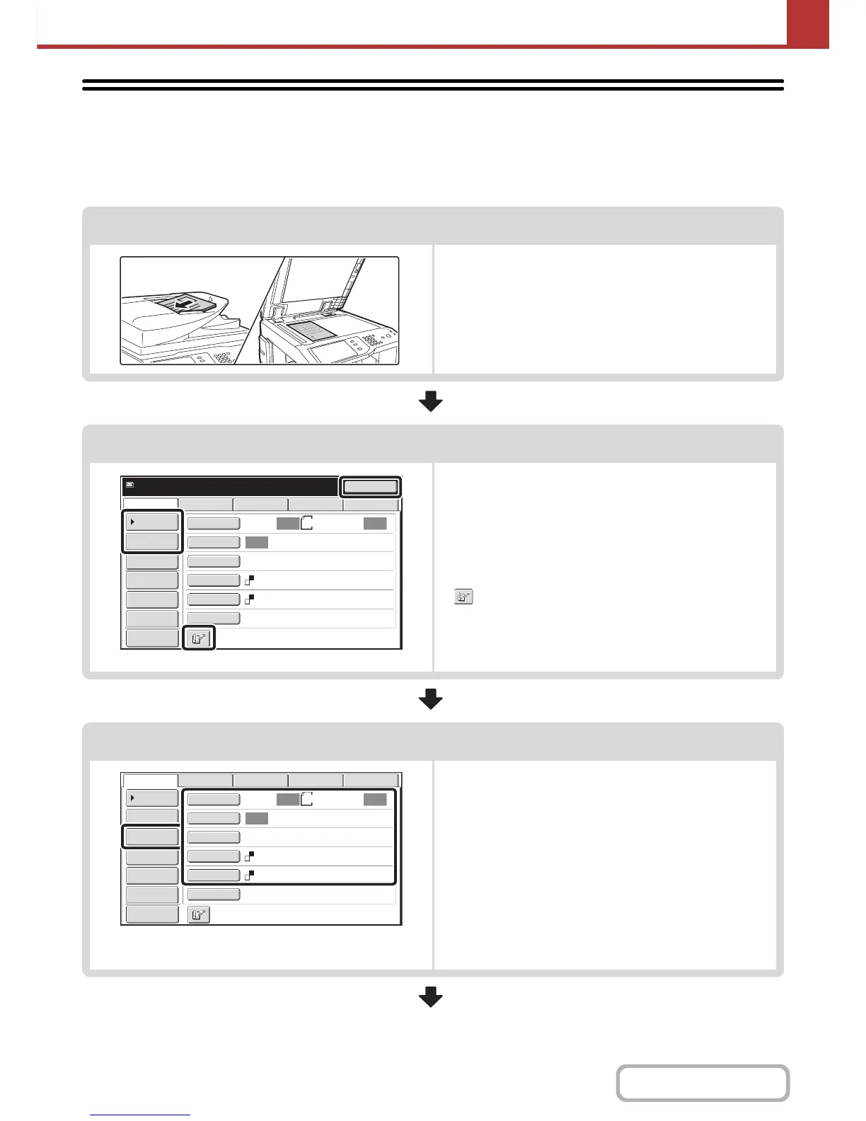 This section explains the basic procedure for scanning and transmission. Select settings in the order shown below to