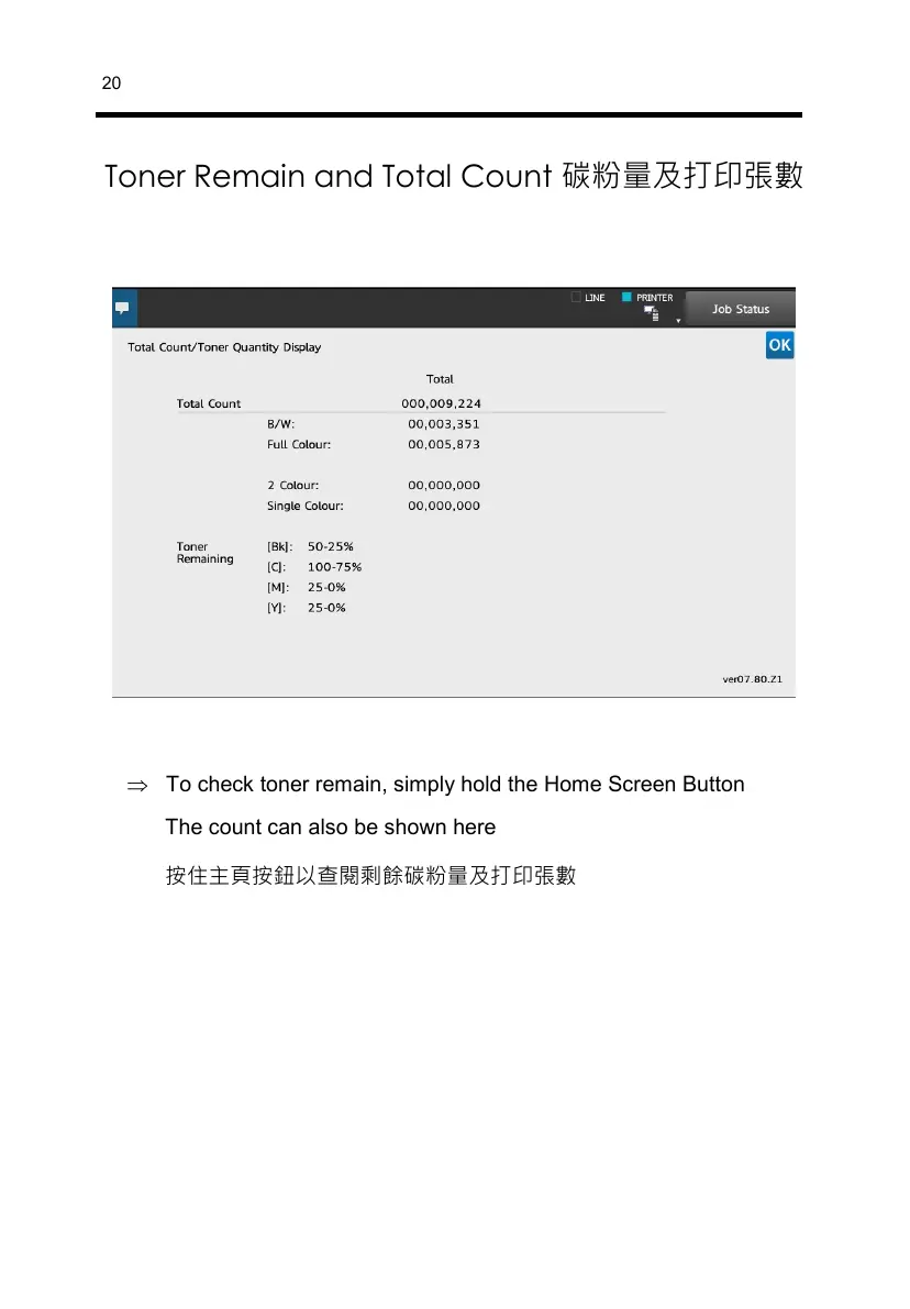 按住主頁按鈕以查閱剩餘碳粉量及打印張數