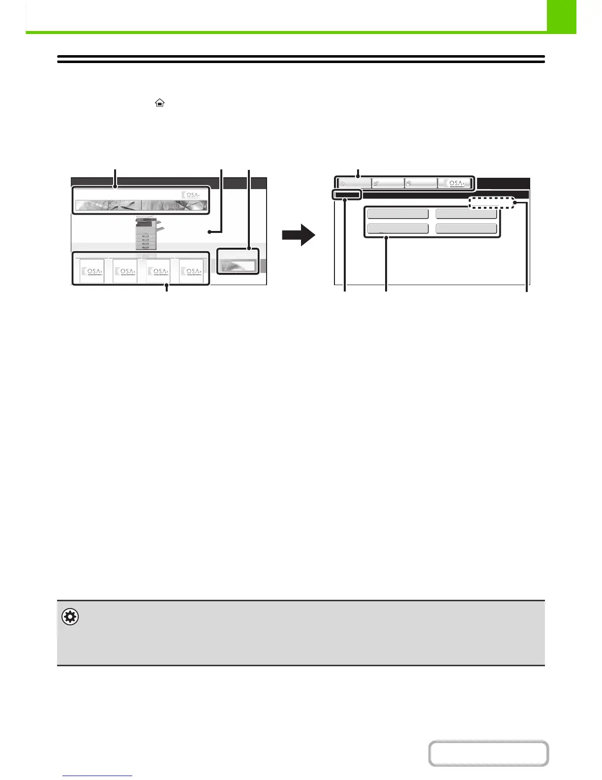 When the [HOME] key () is touched on the touch panel, the home screen appears in the touch panel. Mode selection