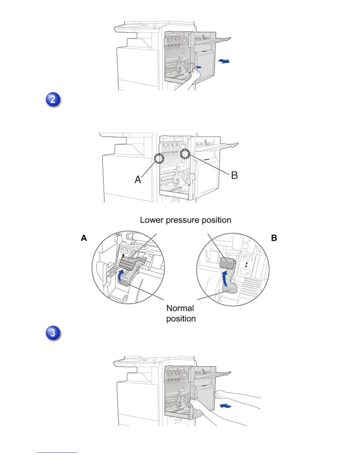 Move the fusing unit pressure adjusting levers (two) to the lower pressure