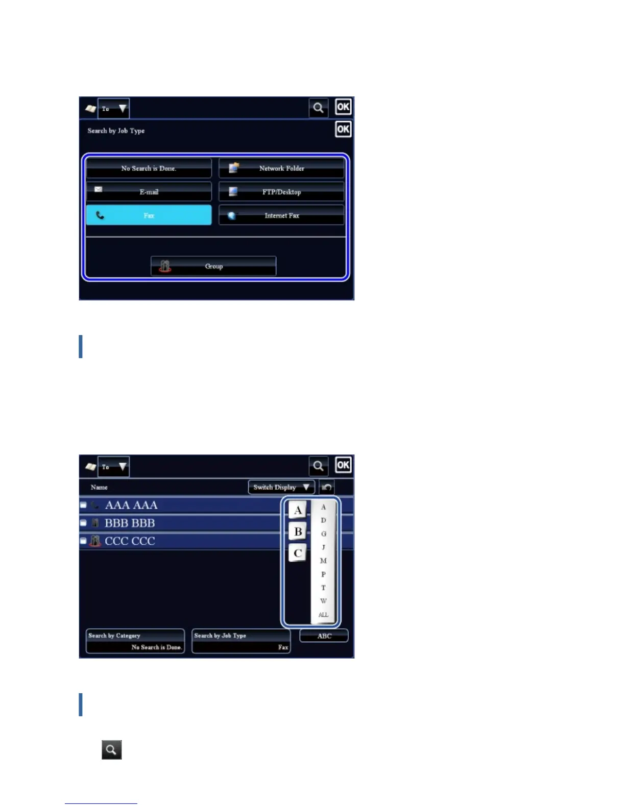 Tap to display a search screen. Select a target for search, enter a keyword and then