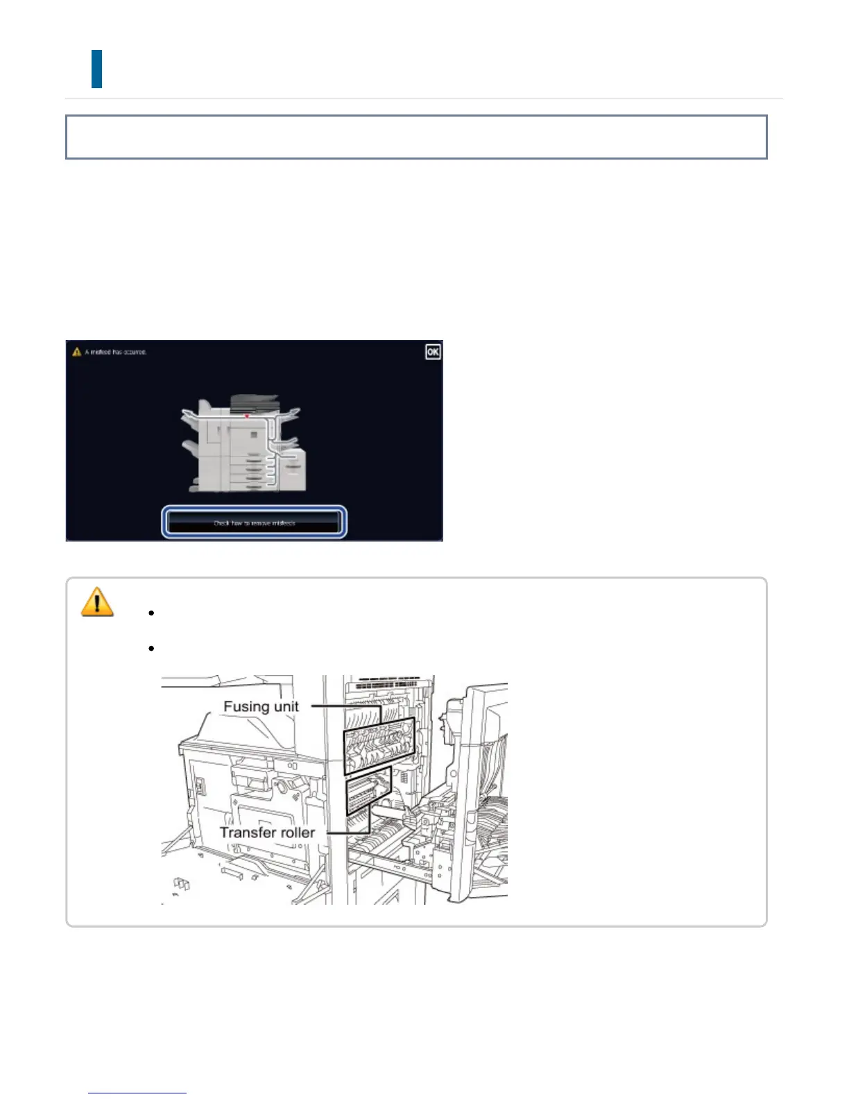 When removing a misfeed, do not touch the fusing unit. You may burn yourself.