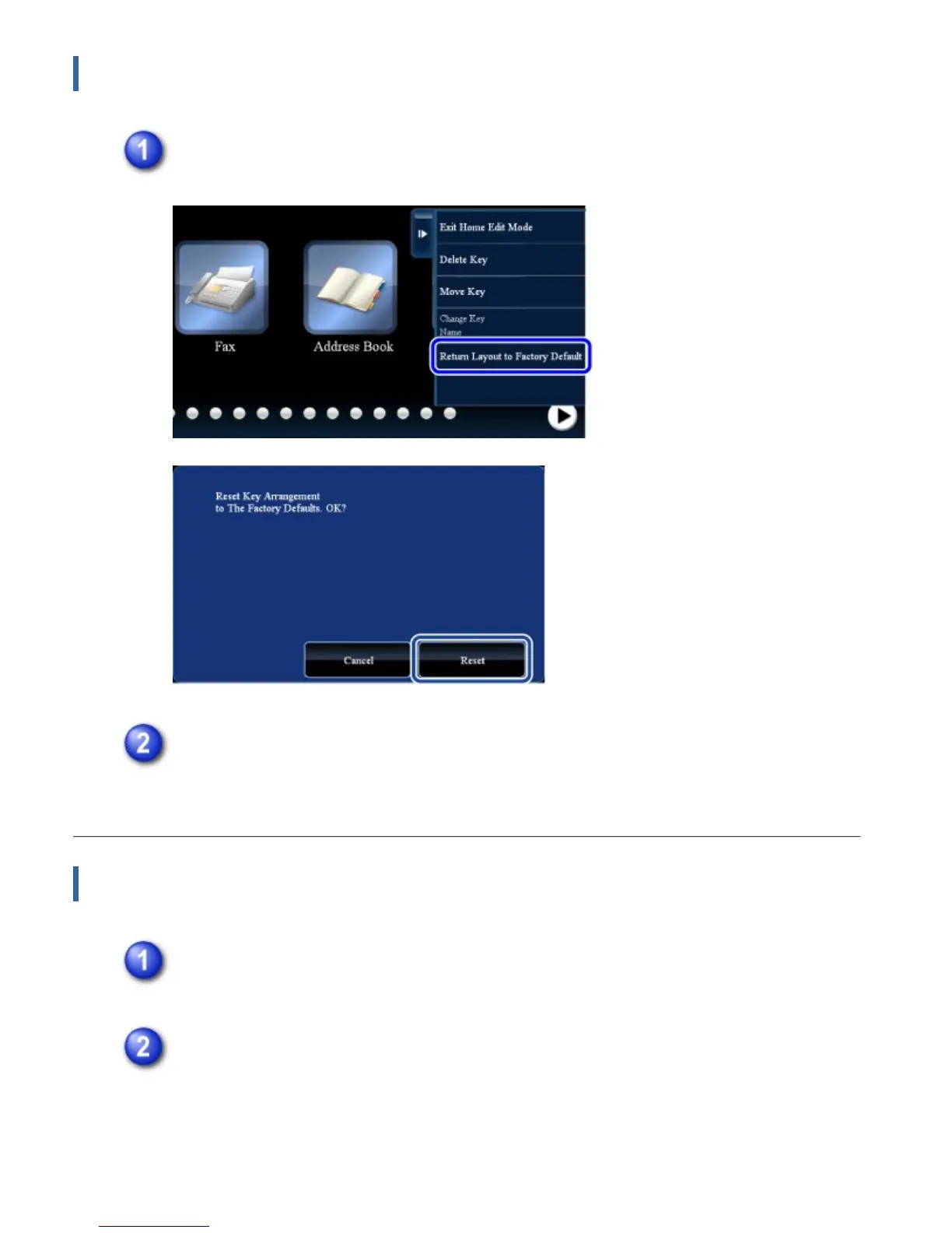 In home edit mode, tap the [Return Layout to Factory Default] key on the