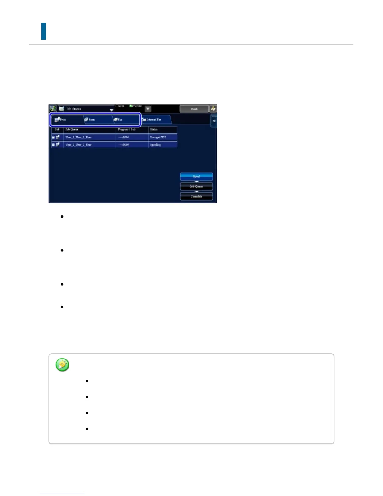 The job status screen is divided into the following four tabs, enabling you to select a job