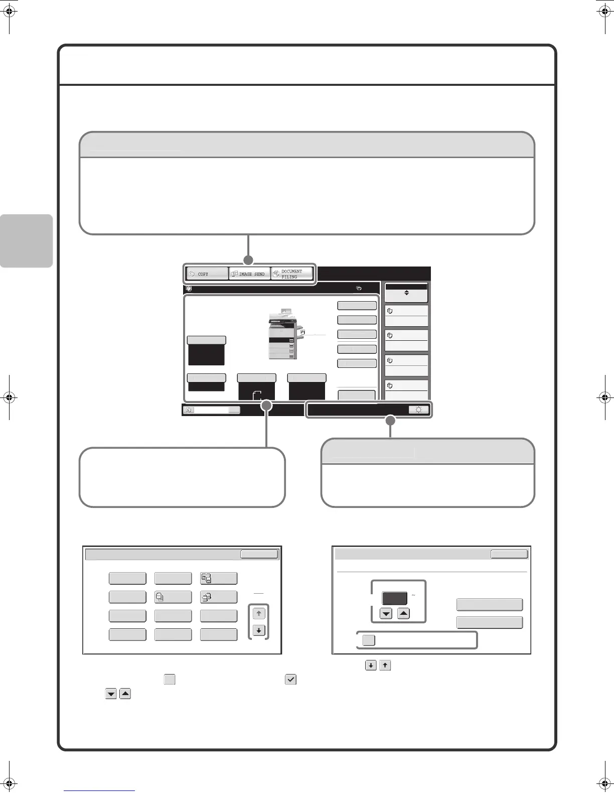 The touch keys that appear in the touch panel are grouped for easy operation. The layout and functions of the