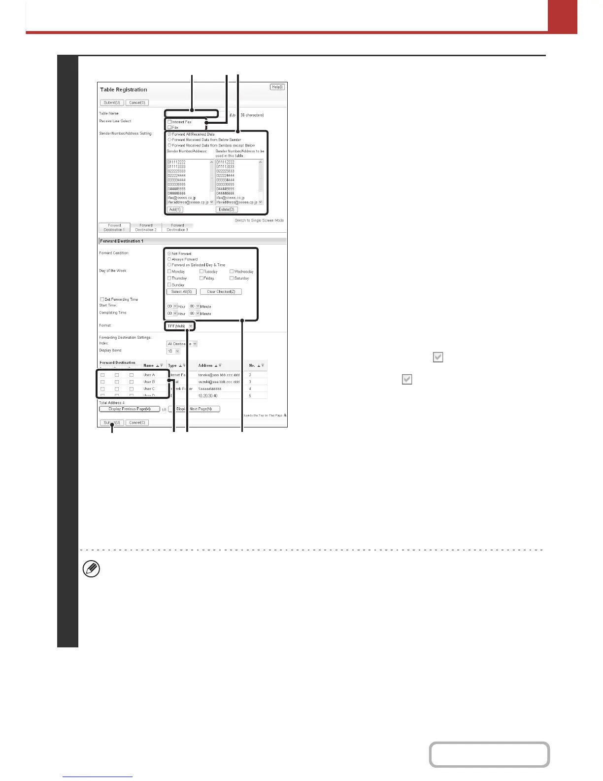 • Up to three forwarding day and time settings can be set for one forwarding table, and a forwarding destination can