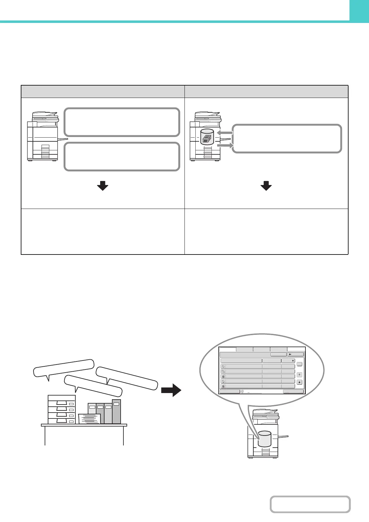 As shown in the example, storing a job with the document filing function frees you of the need to rescan the original and