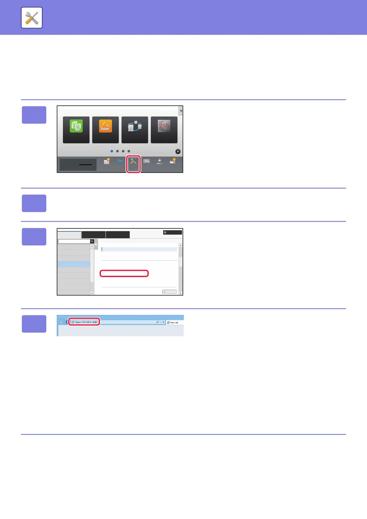 From the setting mode of the machine, print the IP address of the machine and enter the address on the PC’s Web