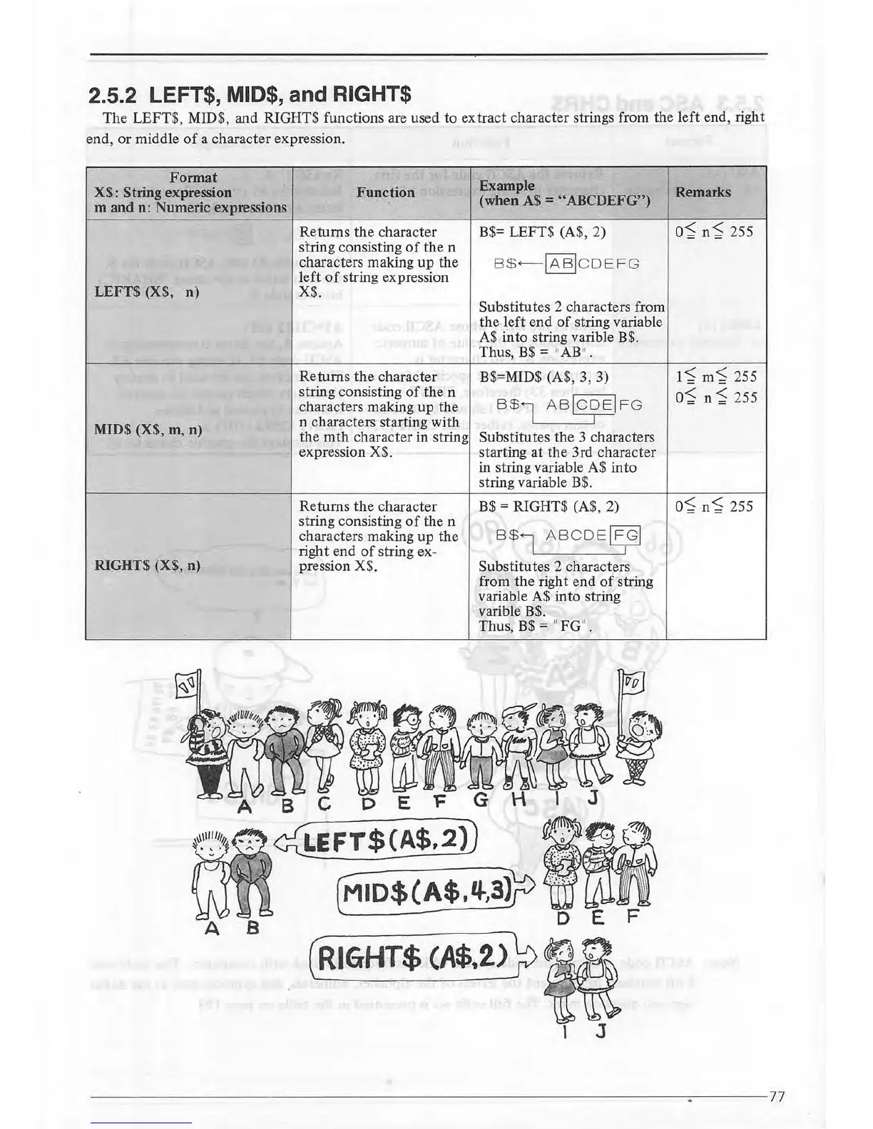 The LEFT$, MID$, and RIGHT$ functions are used to extract character strings from the left end, right