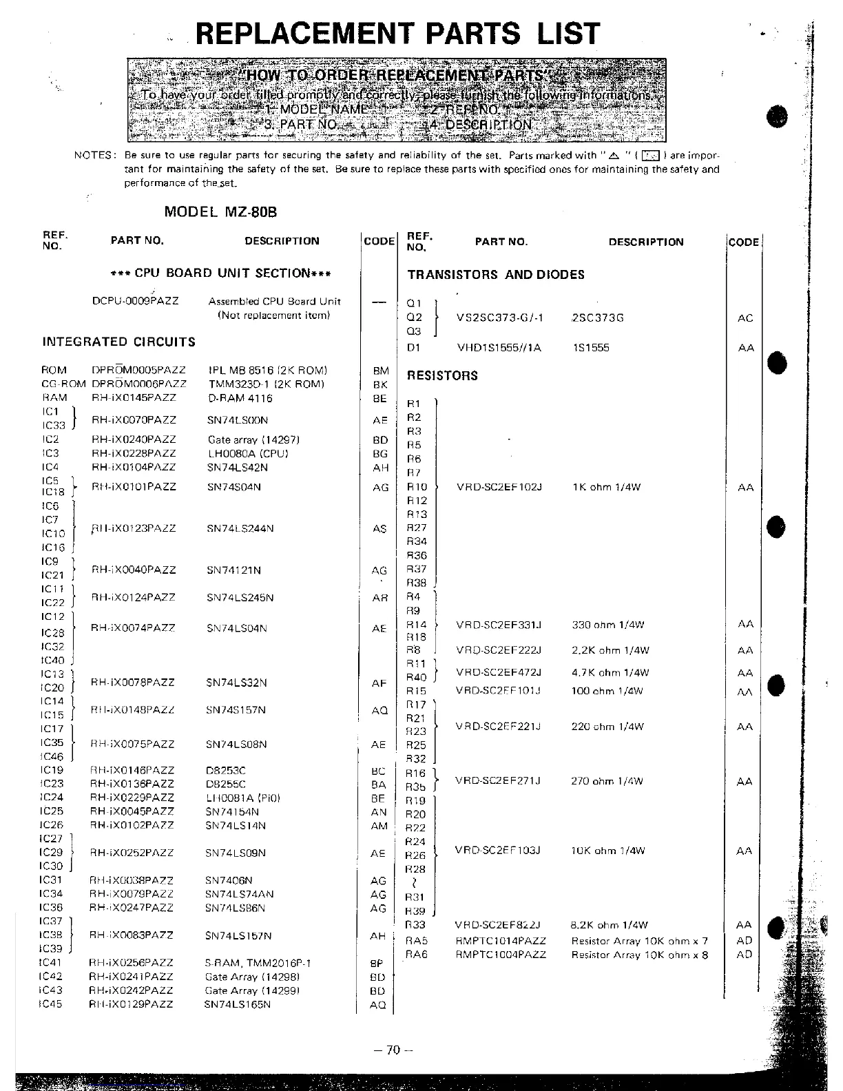 REPLACEMENT PARTS LIST