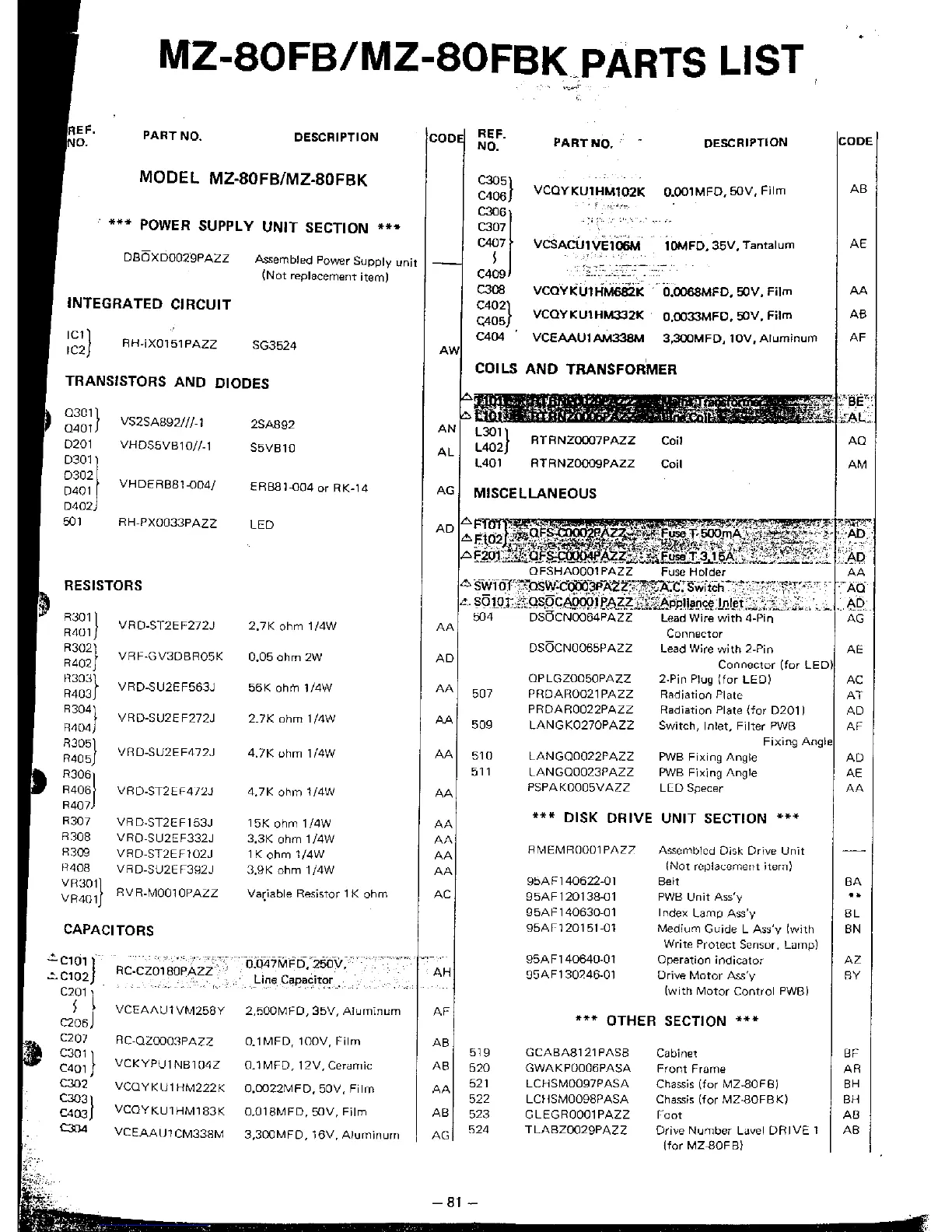 MZ-80FB/MZ-80FBK,PARTS LIST