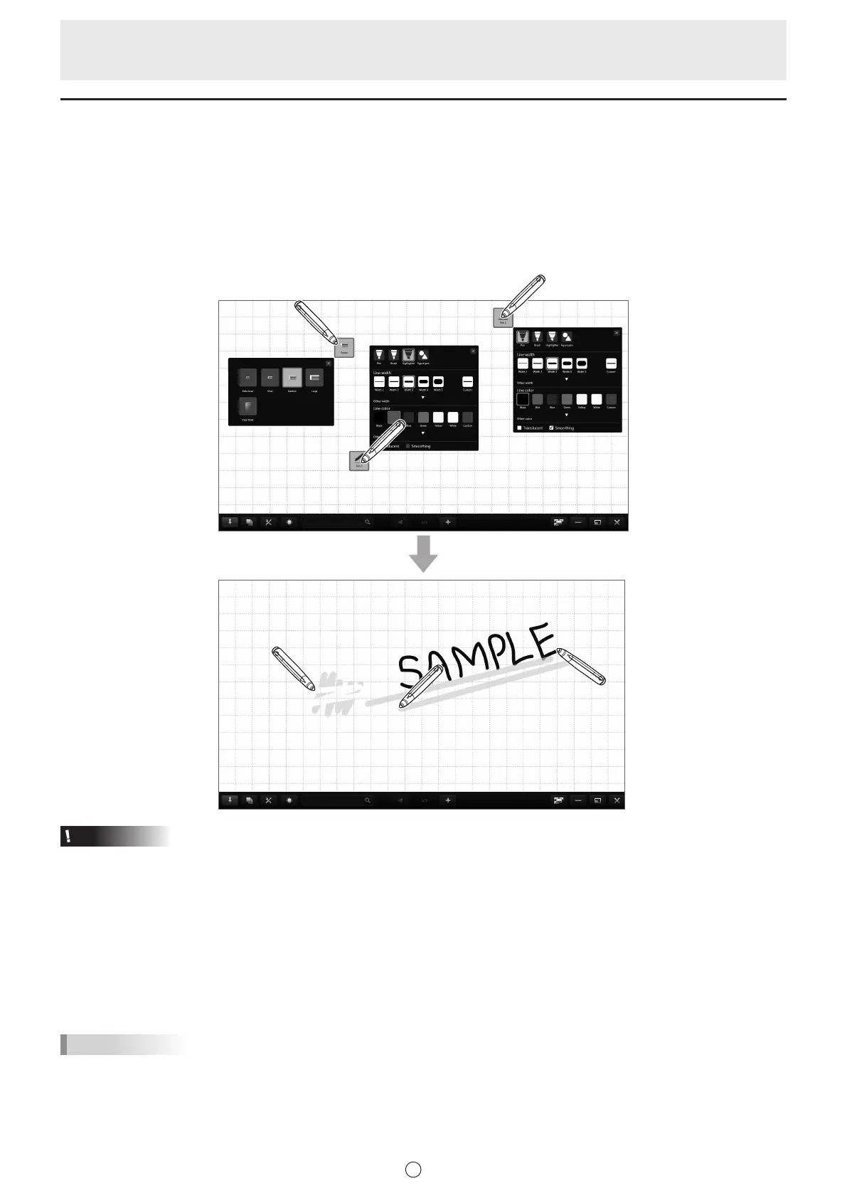 The line color and width of the touch pens can be set separately for “Pen 1” to “Pen 3” and “Eraser”. (Page 29, 30)