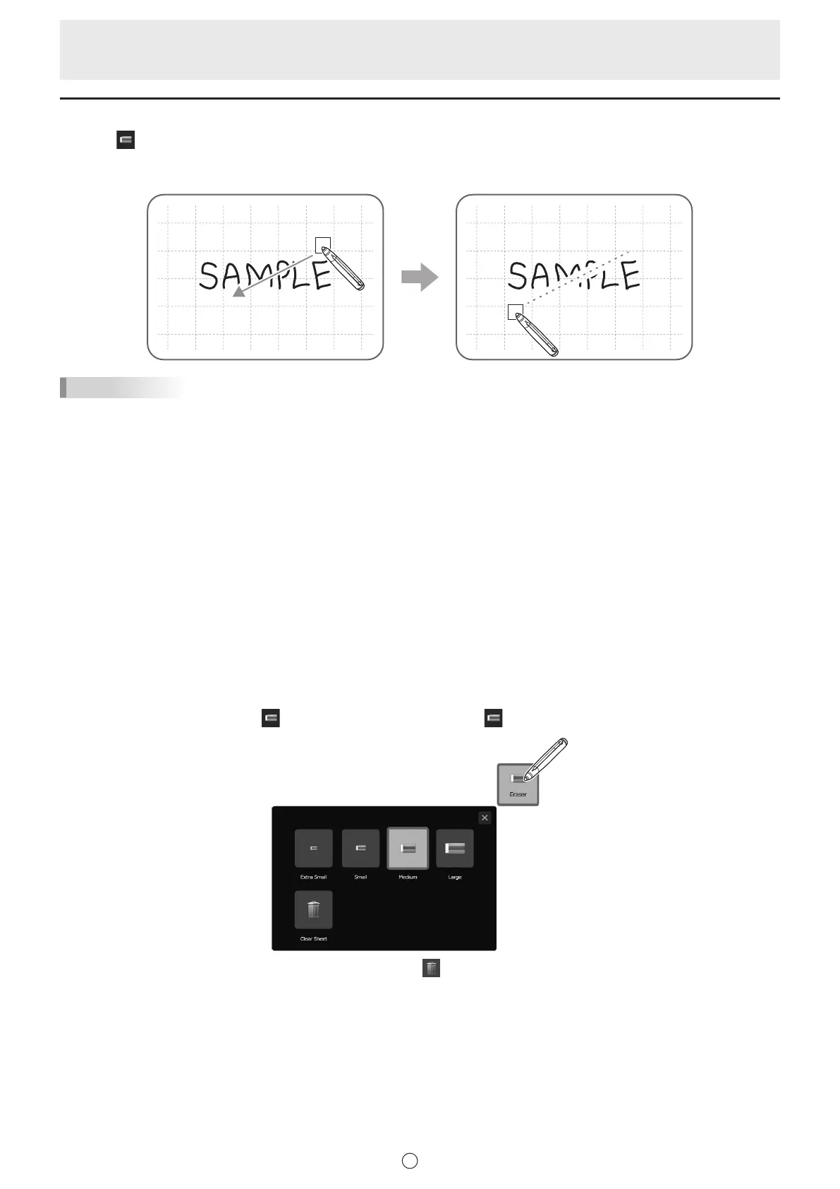 • The eraser function can erase only the objects drawn with the pen function. You cannot use the “Eraser” button to erase