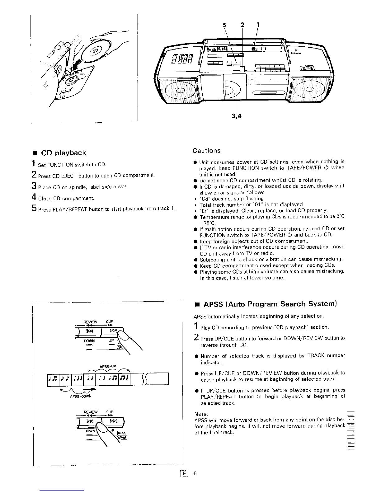 Sharp QT-CD20H - Loading and Starting CD Playback; CD Operation Cautions; Using APSS for Track Selection