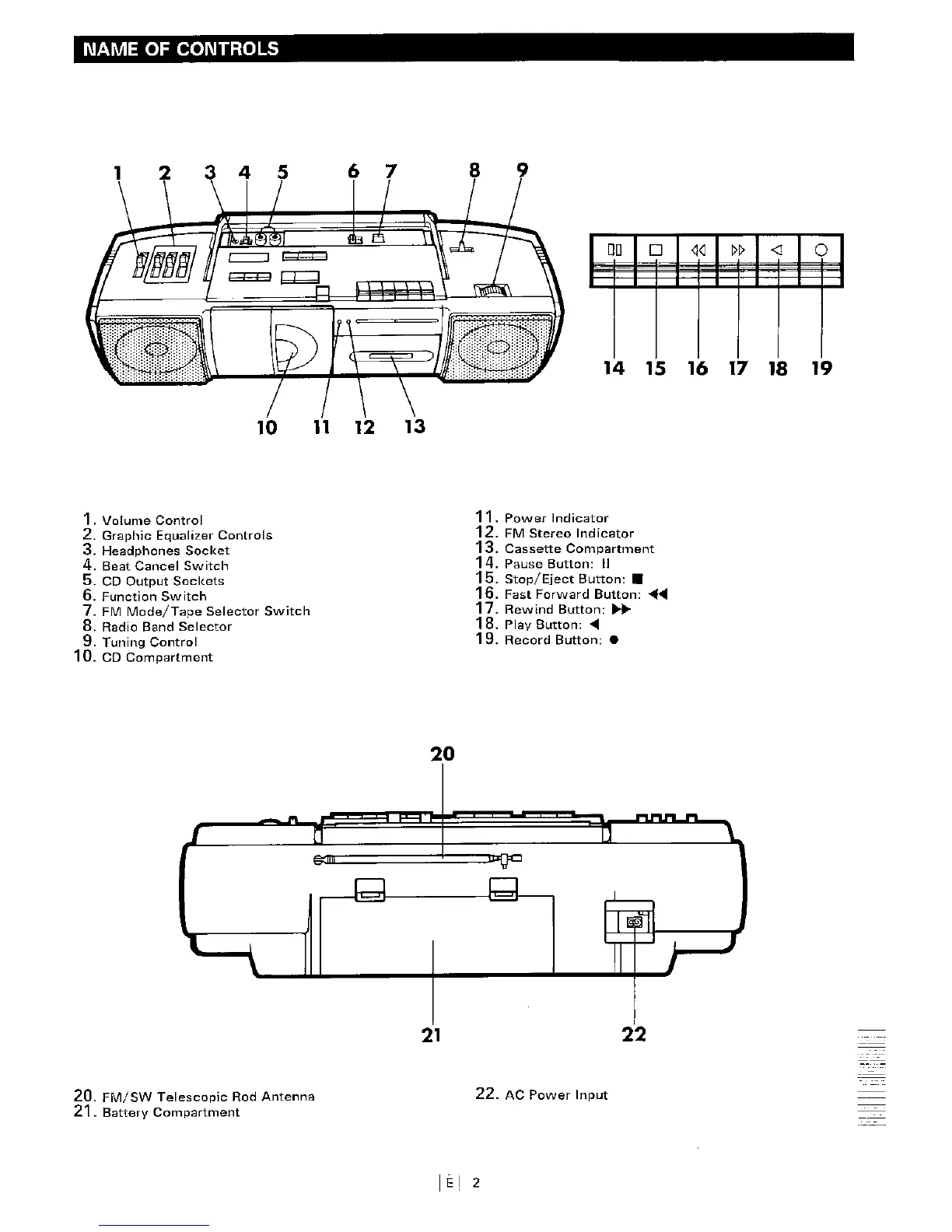 Sharp QT-CD20H - Name of Controls; Front Panel Controls; Playback and Recording Controls; Unit Features and Inputs
