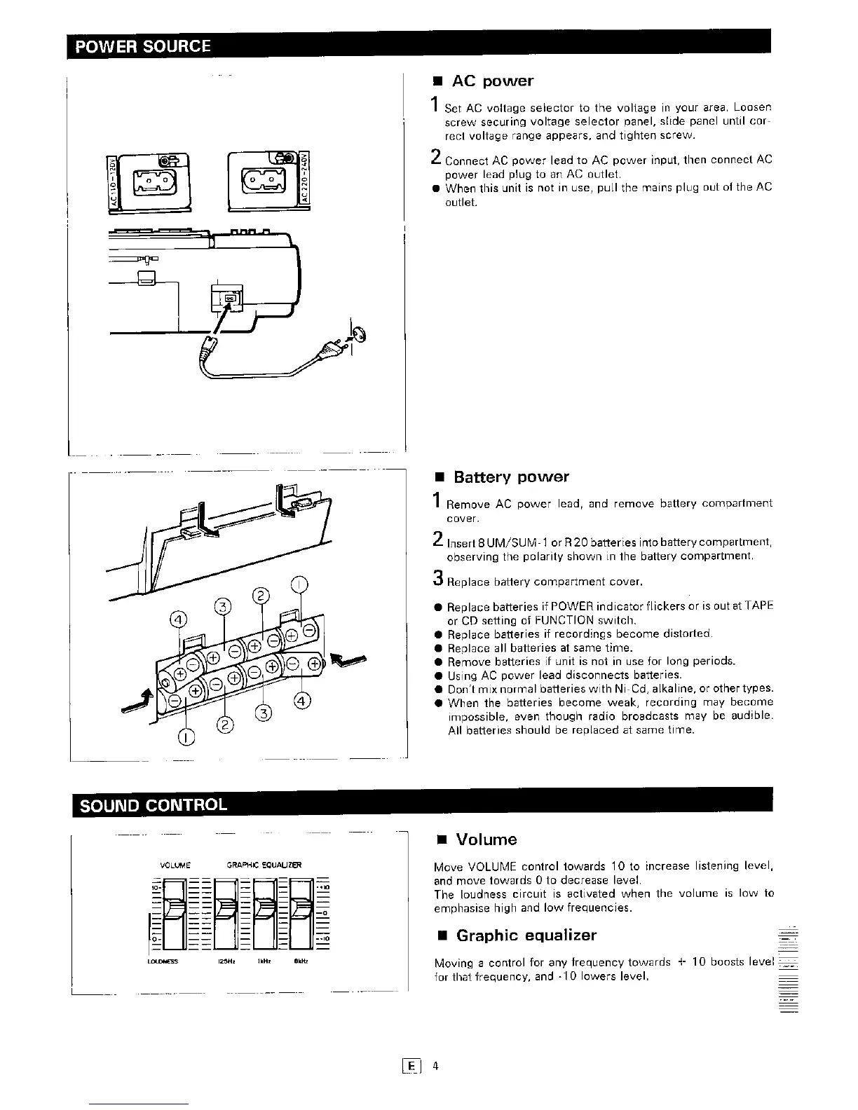 Sharp QT-CD20H - Power Source and Sound Control; AC Power Connection; Battery Power Installation; Volume Adjustment
