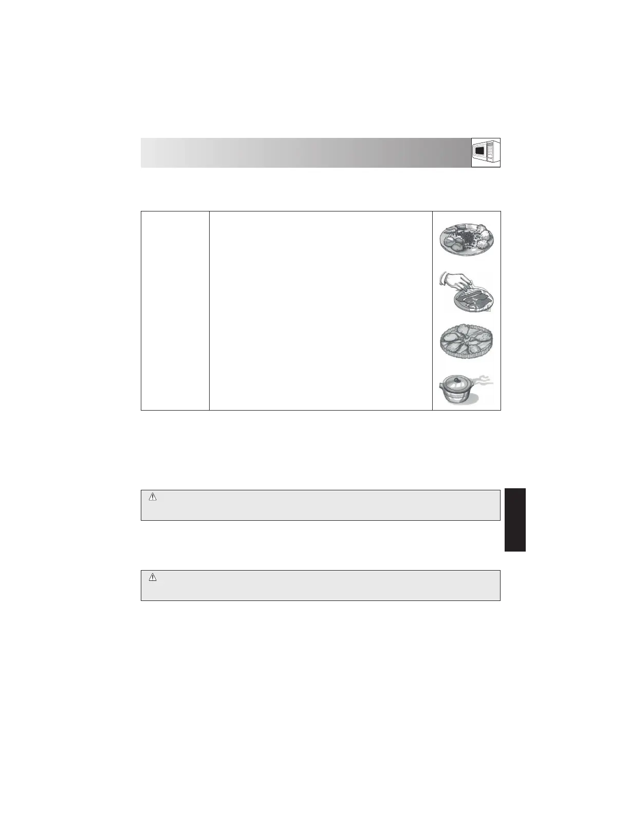 • Reheating times will be a ected by the shape, depth, quantity and temperature of food together with the