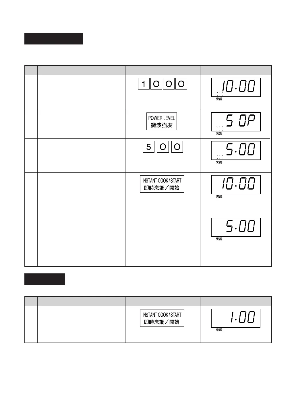 * 假定閣下想先用微波50%(中火)來烹調10分鐘﹐再用微波100%(高火)來烹調5分鐘