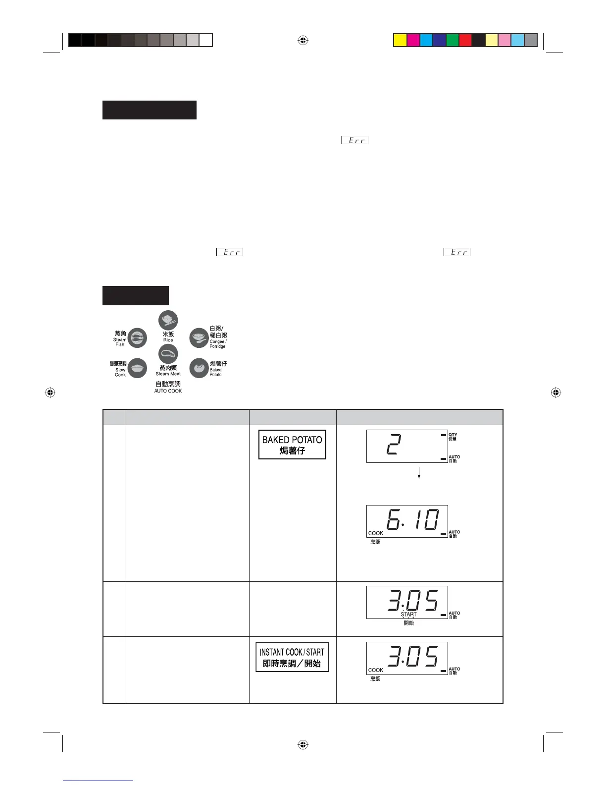 1. 用自動烹調功能來烹調時﹐應按各項烹調指南中的步驟進行烹調以達到最佳的烹調效果。