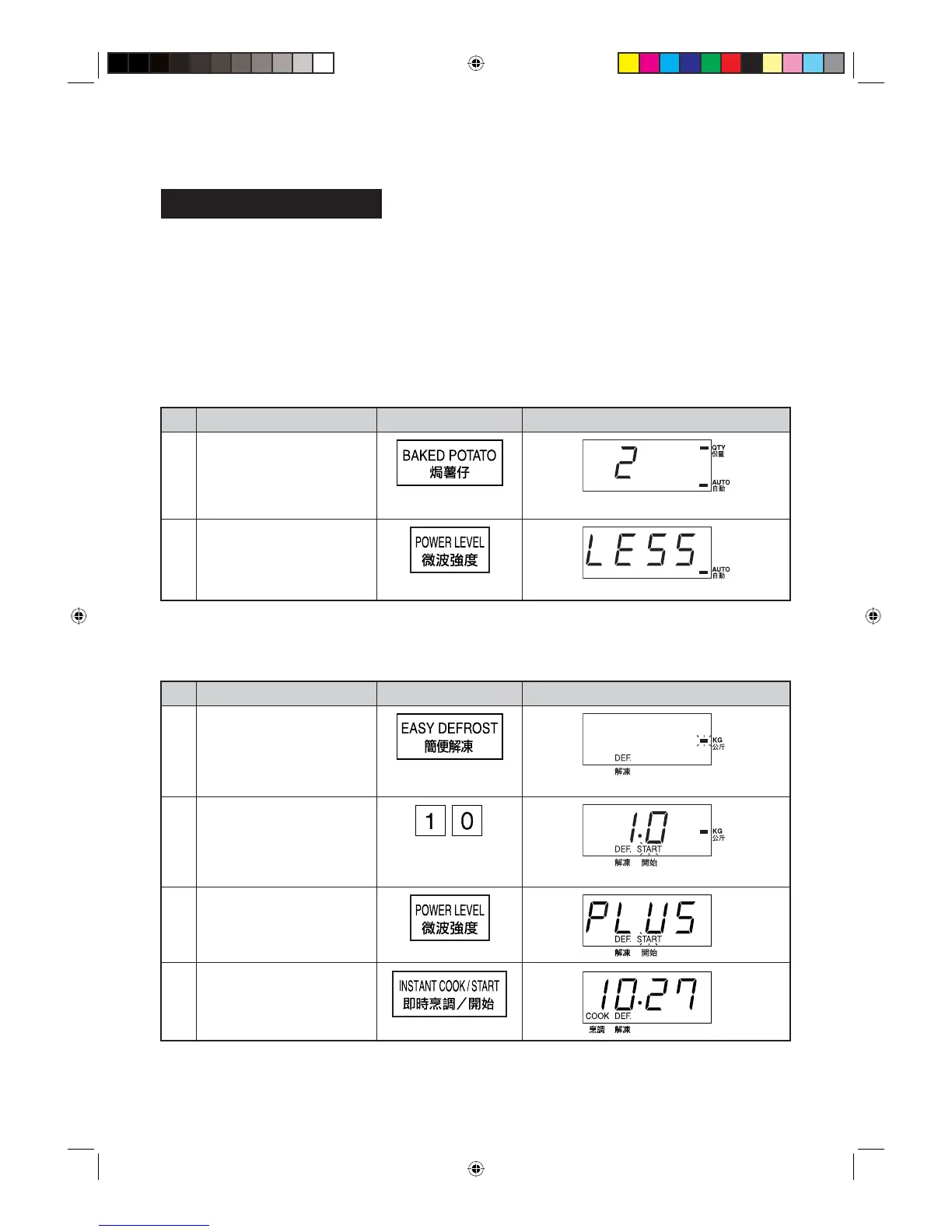 自動烹調指南中的烹調時間是按一般的口味而設定。若想要將烹調時間根據個人喜好加以調整﹐可按微波強度