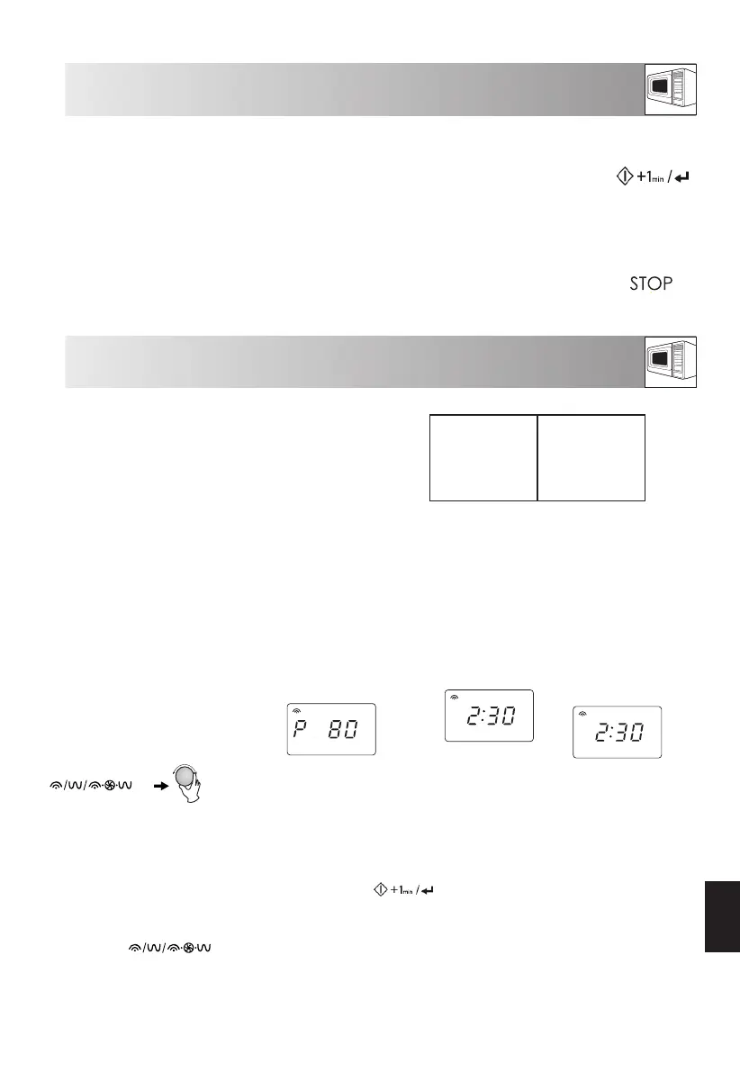 • Kun kypsennys/sulatus on valmis, avaa luukku painamalla STOP-painiketta. Näkyviin tulee aika, jos kello on