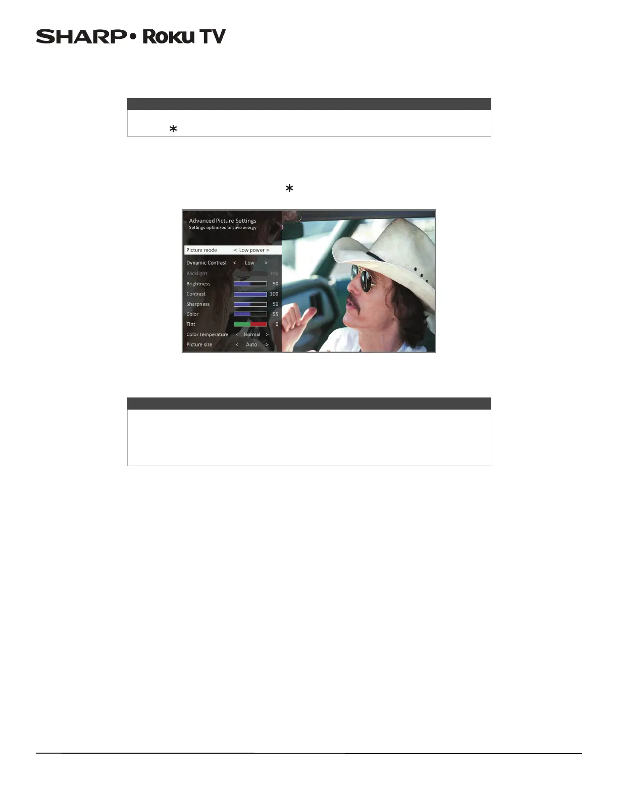 Low power is a power-saving picture mode that reduces power consumption. When you use Low power, you'll notice